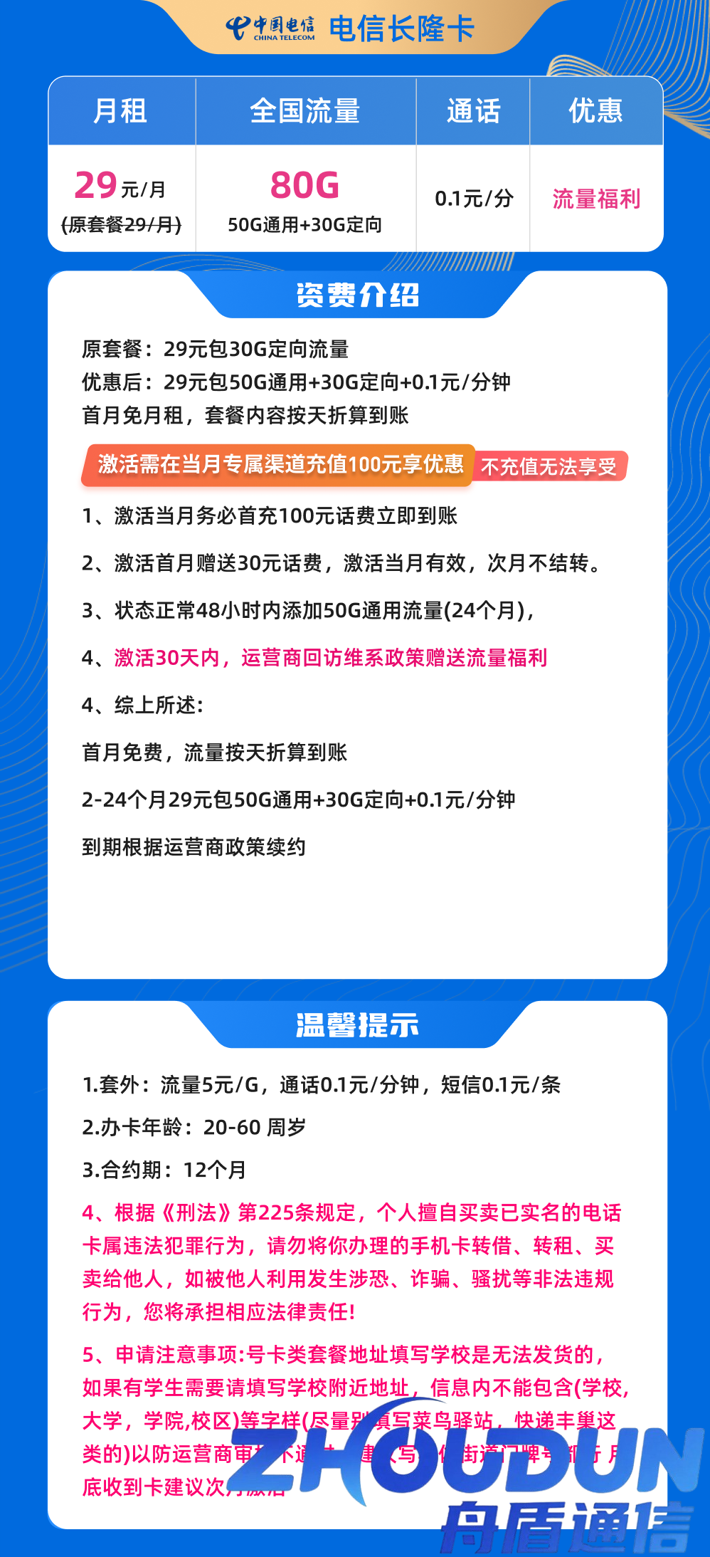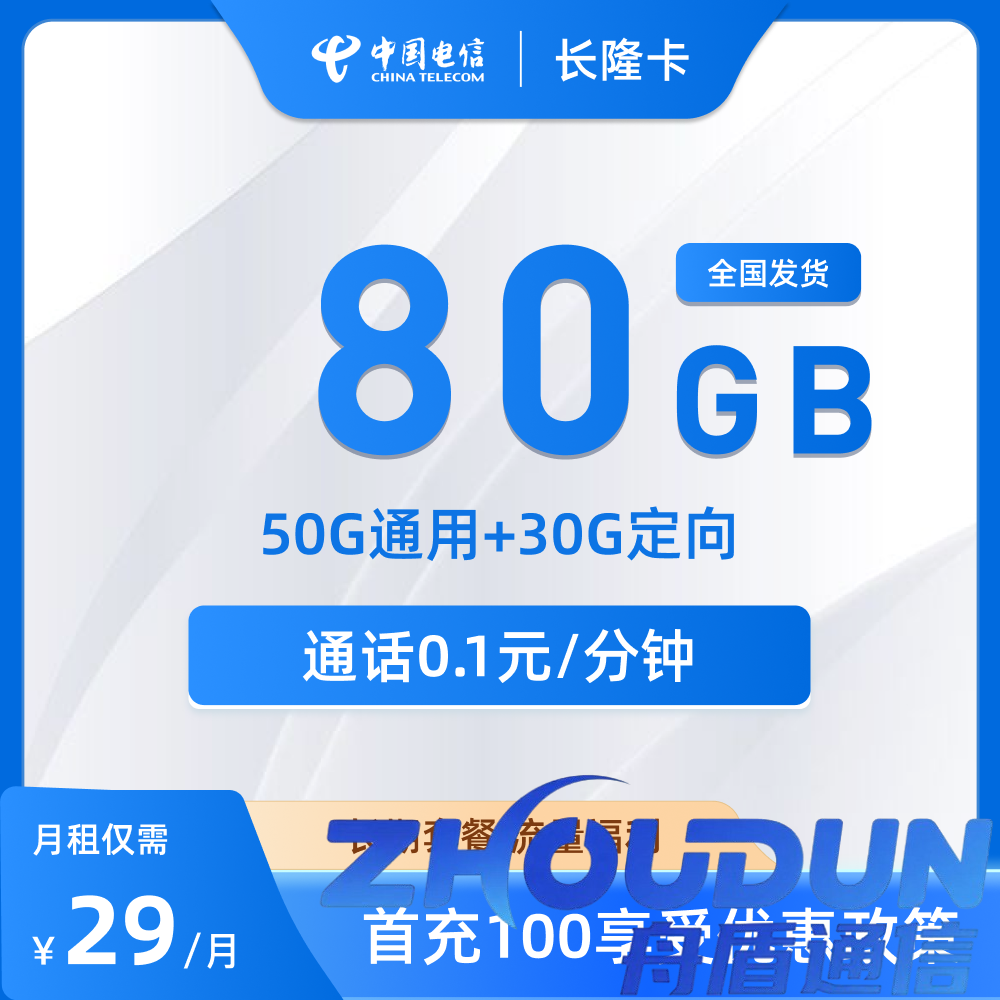 电信长隆卡29元包50G通用+30G定向+通话0.1元/分钟